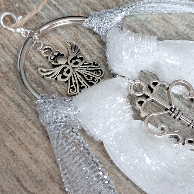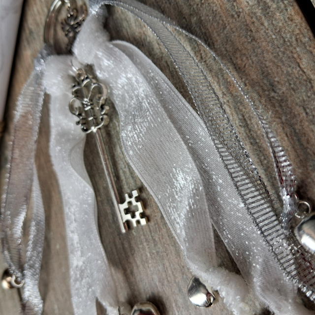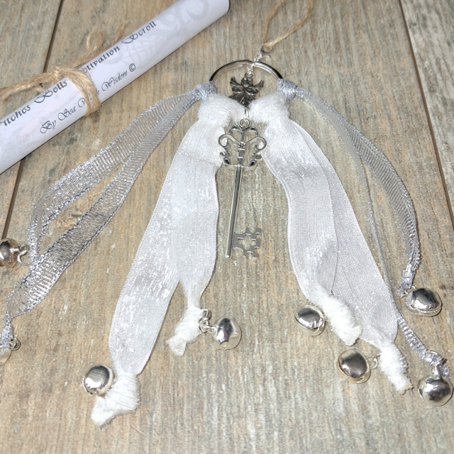 Each Witches Protection Bells Amulet is hand made by Sarena under a protection spell and adorned with silver tone bells attatched to beautiful ribbons, a key and a befitting charm.