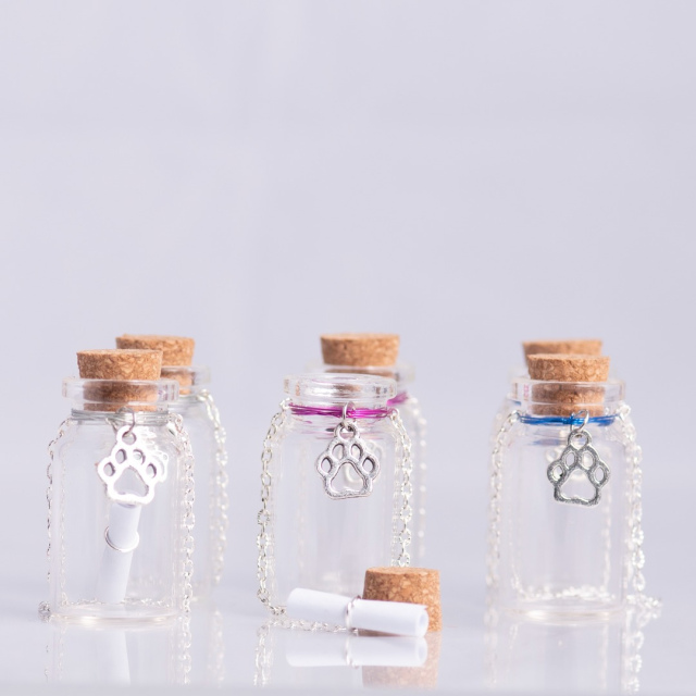 Each pet urn is made to order with care and attention to detail using quality components, metallic tones and coloured charms and wire wrap with a fine but strong silver plated chain. A lovely way of keeping a small amount of your beloved pets ashes or a bit of their fur, stored safely inside the water resistant glass urn.