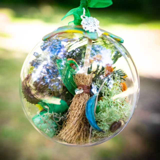 The finishing touch inside each Witches Ball is a befitting wooden besom, sacred to the Goddess, representing the element Water, a powerful symbol of sweeping away energetic clutter, purifying a space and clearing away negative and risidual energy, promoting protection and purifying energy.