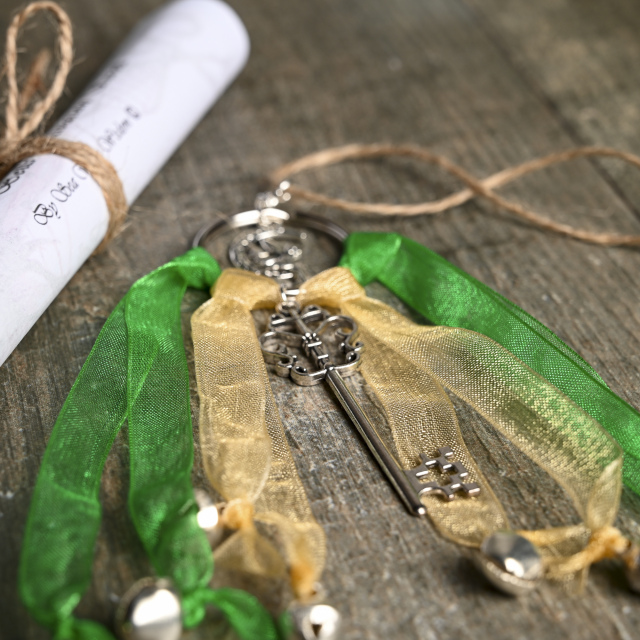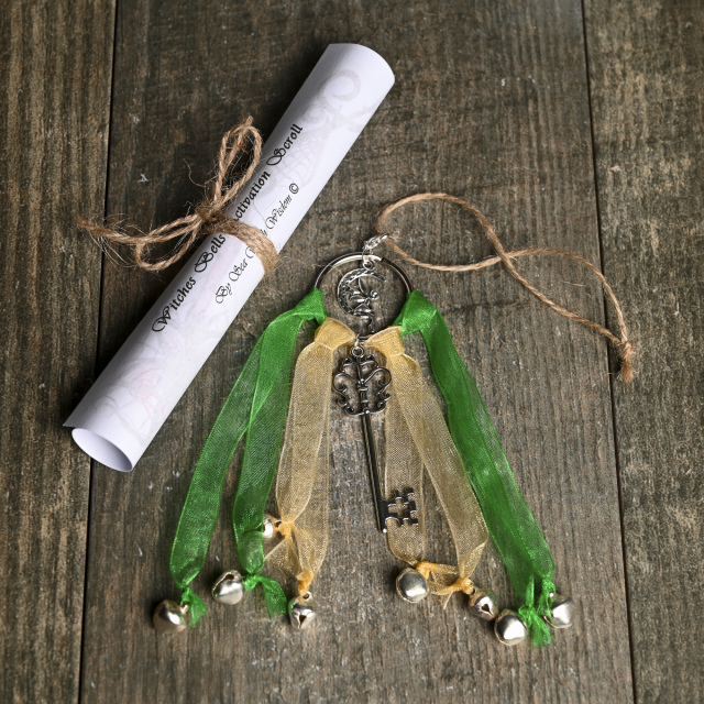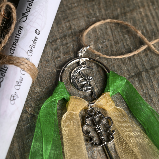 Each Witches Protection Bells Amulet is hand made by Sarena under a protection spell and adorned with silver tone bells attatched to beautiful ribbons, a key and a befitting charm.